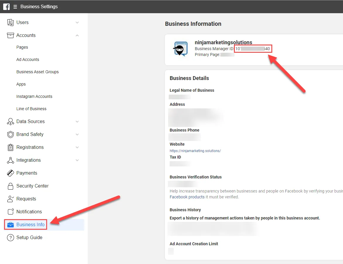 Then find your Business Manager ID at the very top underneath the Business Name.